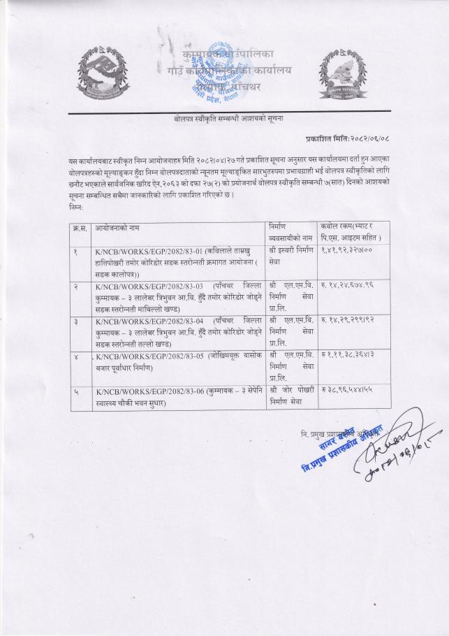 बोलपत्र स्वीकृत सम्बन्धी आवश्यको सूचना !!!