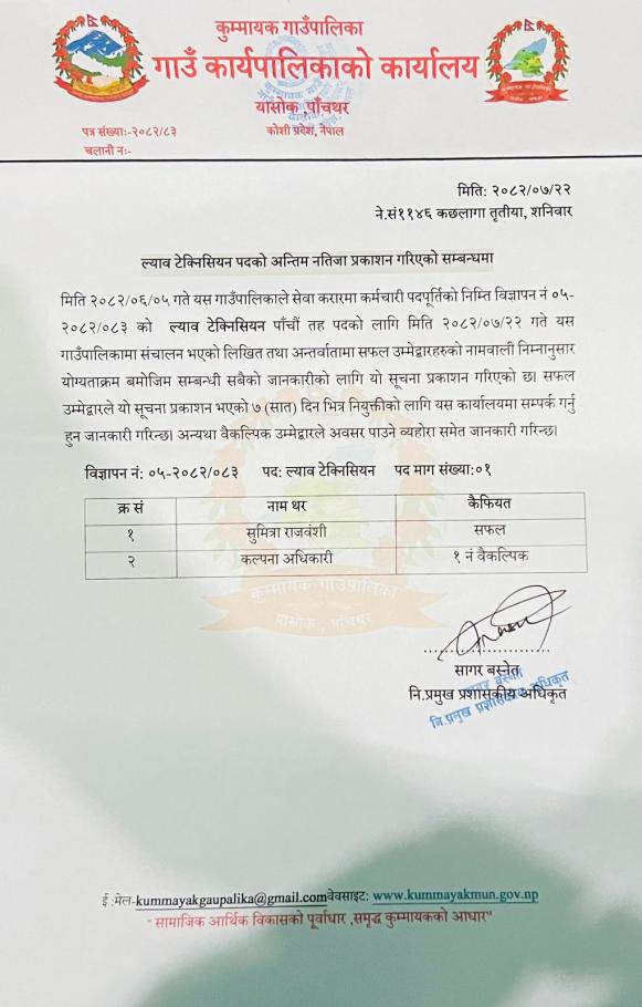 ल्याव टेक्निसियन पदको अन्तिम नतिजा प्रकाशन गरिएको सम्बन्धमा !!!