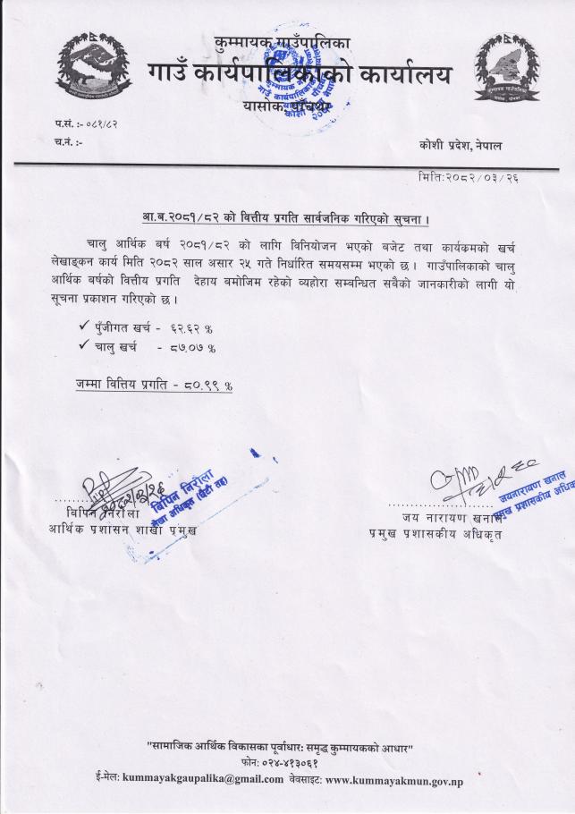 आ.व.२०८०/०८२ को वित्तिय प्रगति सार्वजनिक गरिएको सूचना !!