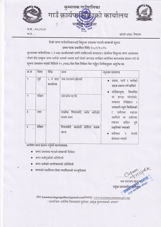 » निजि जग्गा गाउँपालिकाकाई निशुल्क उपलब्ध गराउने सम्बन्धी सूचना !!!
