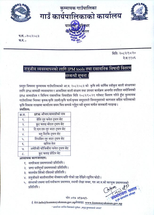 शत्रुजीव व्यवस्थापनको लागि IPM tools तथा रासायनिक विषादी वितरण सम्बन्धी सूचना !!!