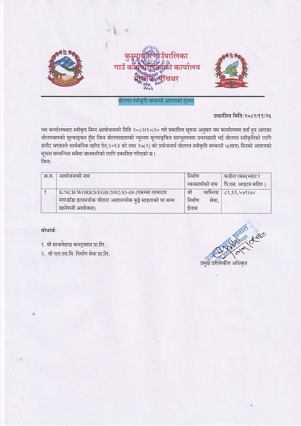 » बोलपत्र स्वीकृत सम्बन्धी आशयको सूचना !!!