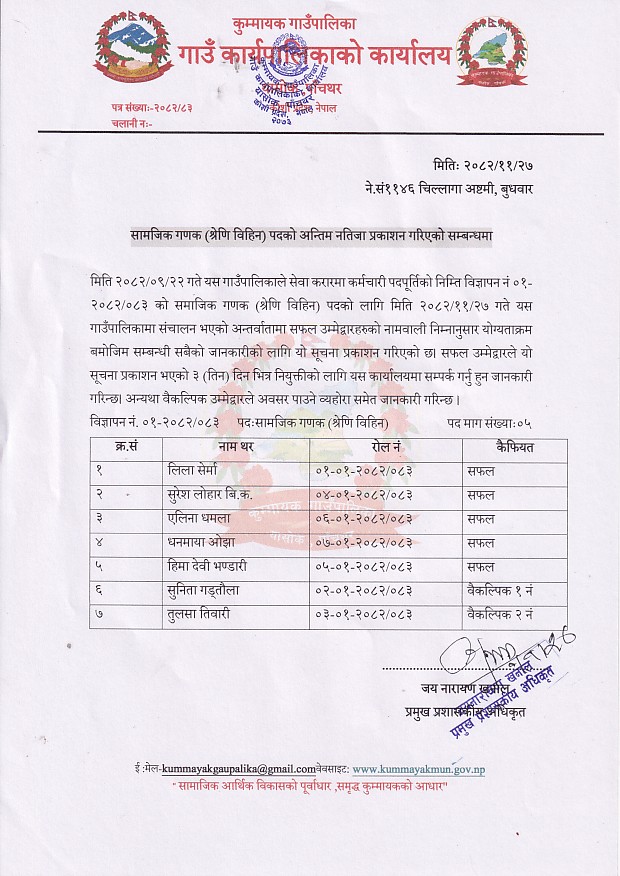 सामाजिक गणक (श्रेणि विहिन) पदको अन्तिम नतिजा प्रकाशन गरिएको सम्बन्धमा !!!